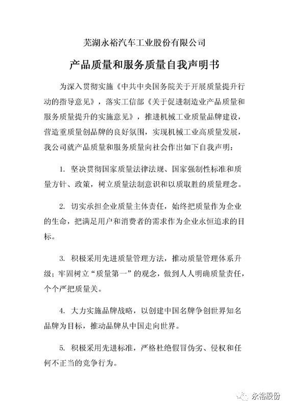 永裕股份發(fā)布產(chǎn)品質量和服務質量自我申明